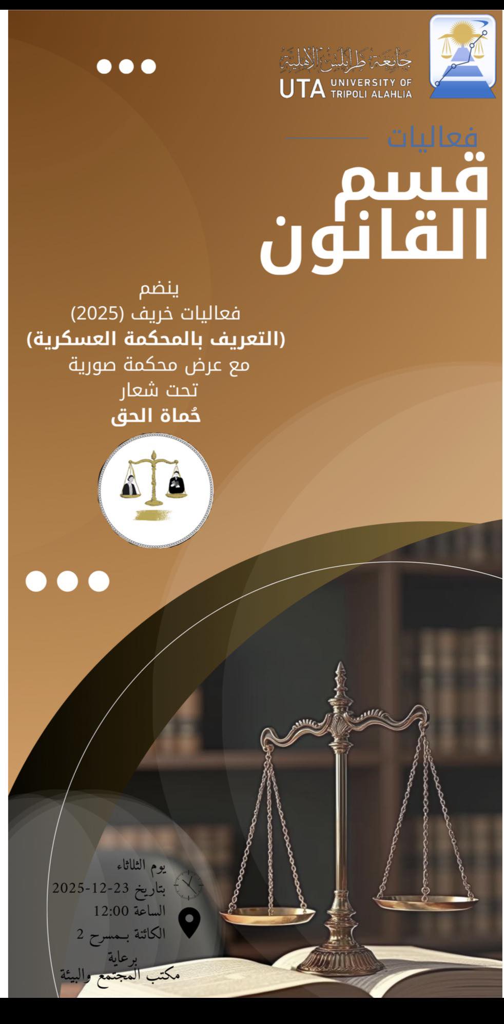 يسرنا دعوة جميع الأعزاء والمهتمين بالشأن القانوني لمشاهدة محاكاة واقعية لإجراءات التقاضي العسكري، والتي يجسدها نخبة من طلاب القسم.