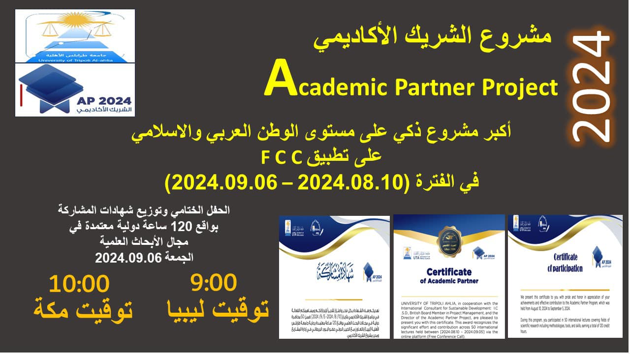 اقرأ المزيداليوم الختامي لمشروع الباحث الاكاديميسيكون اليوم الختامي لمشروع الباحث الاكاديمي الذي تشرف عليه جامعة طرابلس الاهلية يوم الجمعة 6/9/2024 عن طريق تطبيق Free callوذلك بعد عرض 51 محاضرة دولية لتنمية قدرات اعضاء هيئة التدريس والباحثين في مجالات البحث العلمي——————&mdas...