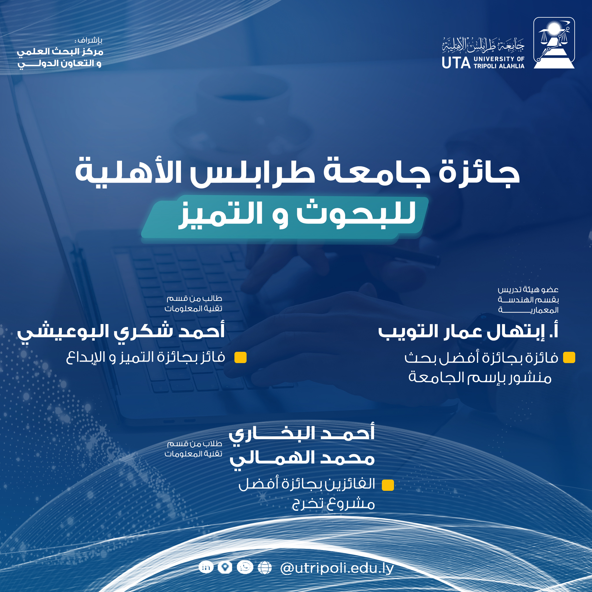 الفائزين بجوائز جامعة طرابلس الاهلية للتميز والبحوث (النسخة الثالثة)________________________________________________إنطلاقا من دور جامعة طرابلس الاهلية في دعم البحث العلمي وتحفيز الباحثين وبتنظيم من مركز البحث العلمي والتعاون الدولي بالجامعة، إنطلق الاعلان عن التقدم لجائز جامعة طرابلس الاهلية للتميي...
