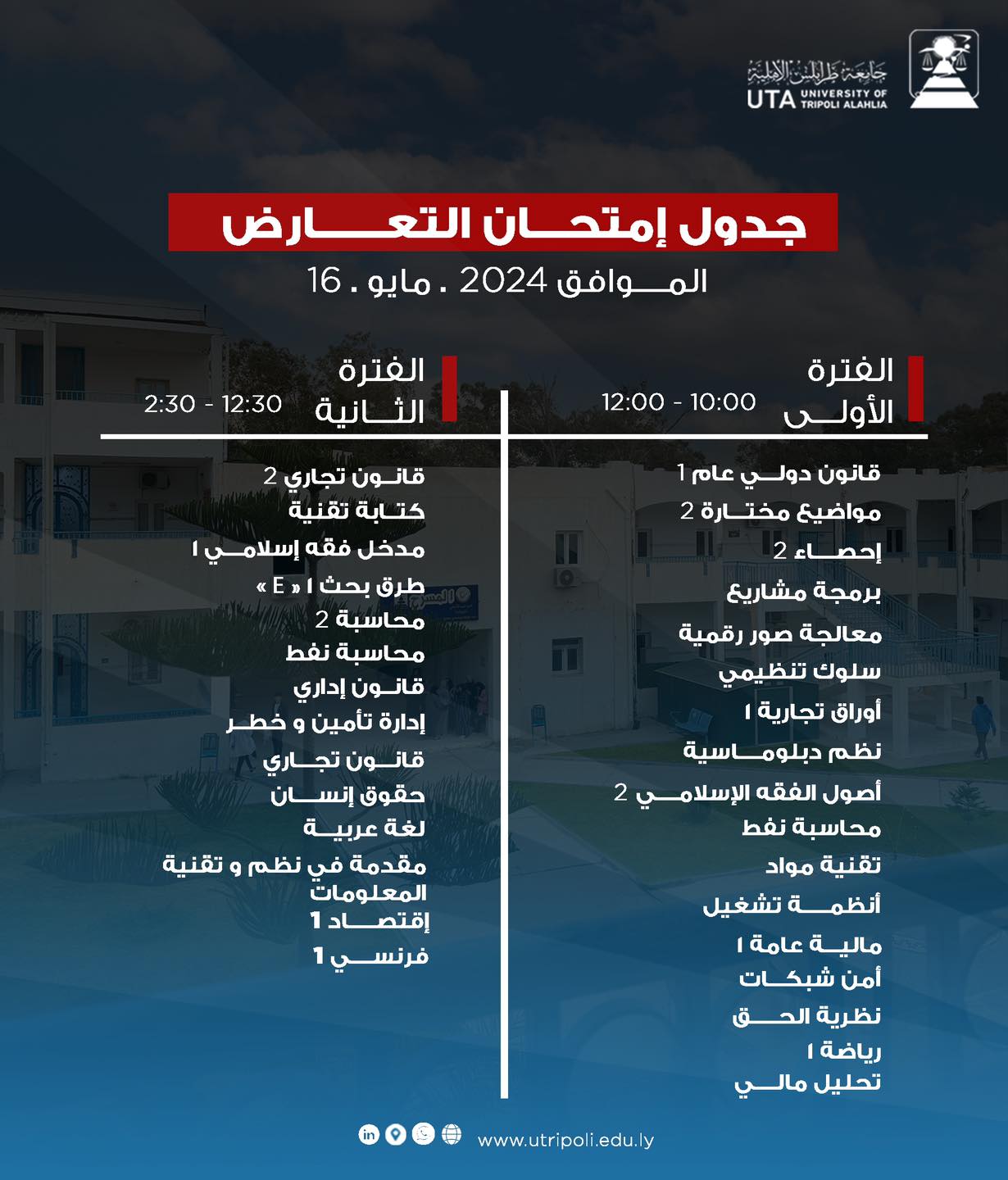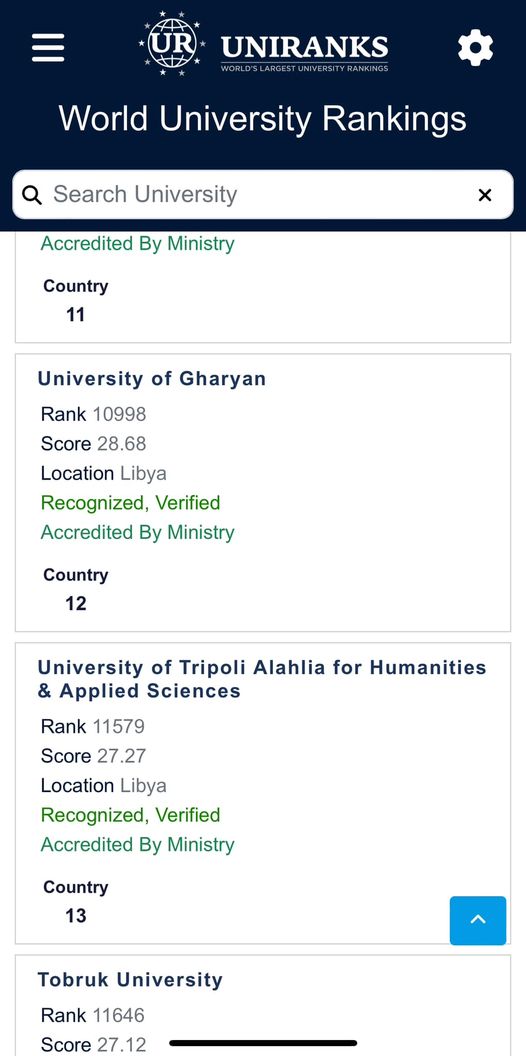 اقرأ المزيد· صدور تصنيف الجامعات حسب مؤشر UniRank الدوليوتحصلت جامعة طرابلس الأهلية على المرتبة 13 محليا والاولي علي الجامعات الخاصة المعتمدةرابط التصنيفhttps://www.uniranks.com/ranking?country=Libya......