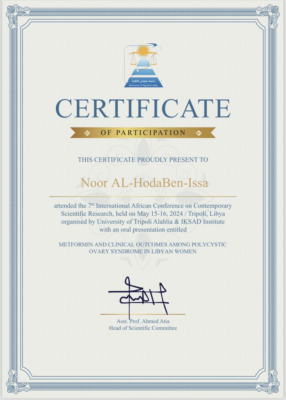 اقرأ المزيدمشاركة بحثية اليوم للطالبة نورالهدي بن عيسي من قسم المختبرات الطبية في المؤتمر الافتراضي الدولي السابع للدراسات الافريقية المتقدمة تنظيم جامعة طرابلس الاهلية بالتعاون مع معهد التنمية الاقتصادية بتركيا7th International African Conferenceمشاركة بعنوانMETFORMIN AND CLINICAL OUTCOMES AMONG POLYCYST...