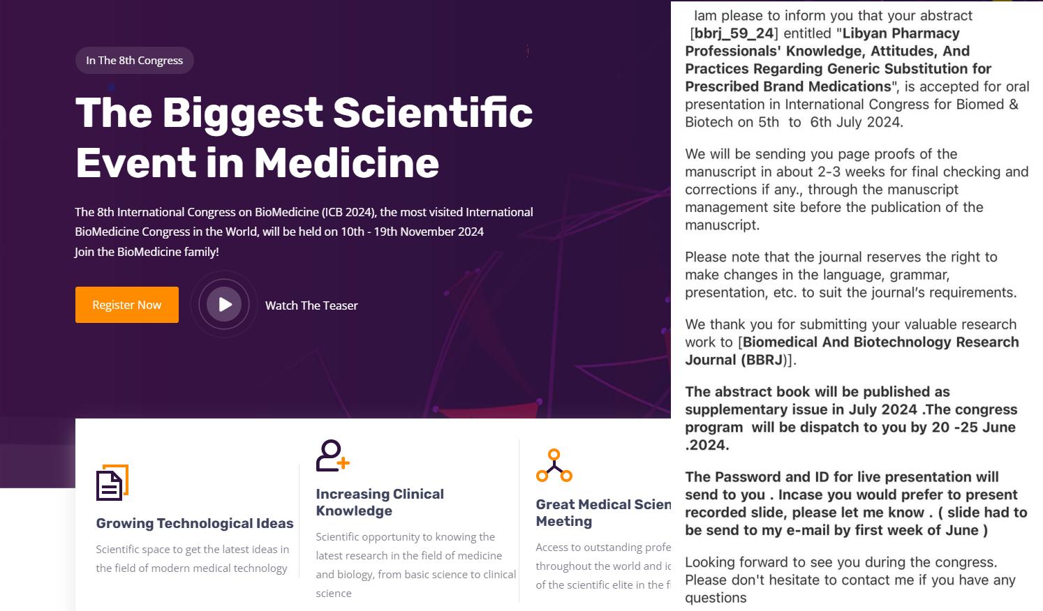 اقرأ المزيدبدعم وإشراف مركز البحث العلمي والتعاون الدولي بالجامعةتم قبول مشاركة طالبات من قسم العلوم الصيدلانية بالجامعة (اية ارحومة - لمي بن غرسة) لالقاء بحث ضمن مشروع تخرجهم بالمؤتمر الدولي للطب الحيوي والتكنولوجيا الحيوية والمقام بإيران (المشاركة اونلاين) ايام 5-6 يوليو 2024علما بإن مستخلصات المؤتمر ستنشر ب...
