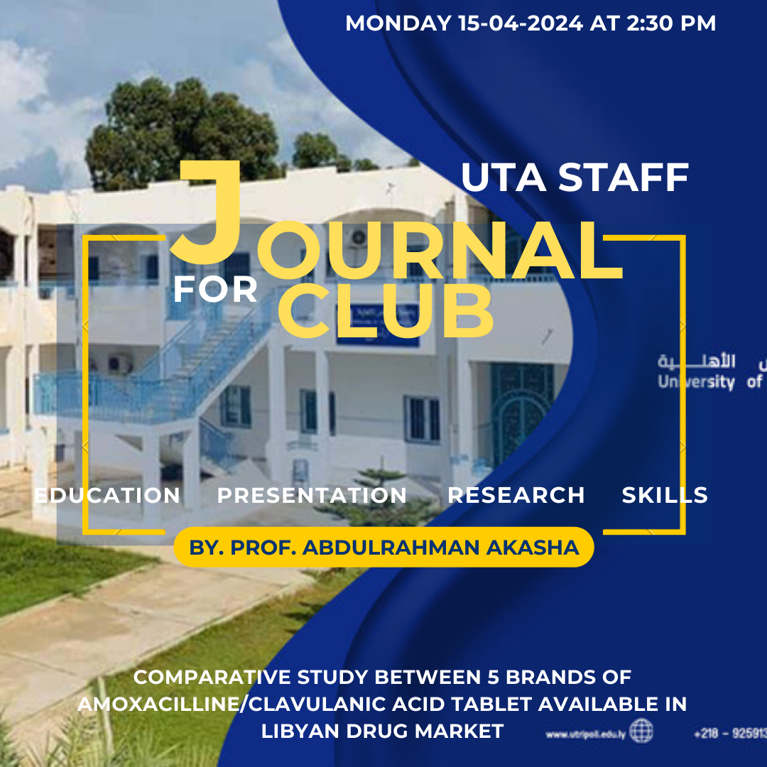 في المحاضرة الرابعة لبرنامج "نادي المجلات" Journal Club لعام 2024سيتم القاء محاضرة حول بحث علمي القاء ا.د. عبدالرحمن عكاشة رئيس قسم العلوم الصيدلانية وذلك يوم الاتنين 15-4-2024 م علي تمام الساعة 2:30 ظهرا المحاضرة حول: دراسة مقارنة بين 5 انواع من أقراص أموكساسيلين/حمض الكلافولانيك المتوفرة في سوق ...
