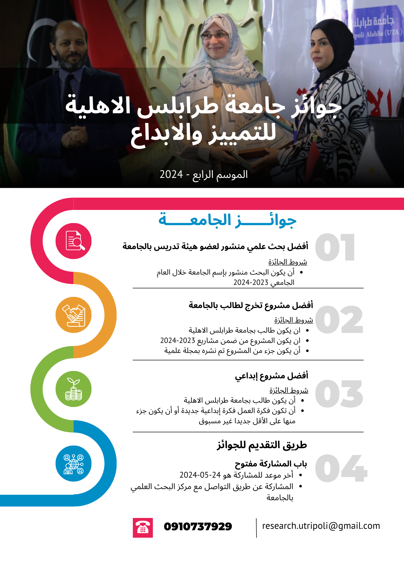 اقرأ المزيديعلن مركز البحث العلمي والتعاون الدولي بجامعة طرابلس الاهلية إنطلاق "جائزة جامعة طرابلس الاهلية للتمييز والابداع - الموسم الرابع" جوائز الجامعة كتالي: أفضل بحث علمي منشور لعضو هيئة تدريس بالجامعة أفضل مشروع تخرج لطالب بالجامعة أفضل مشروع إبداعي الباب مفتوح للمشاركة أخر مو...