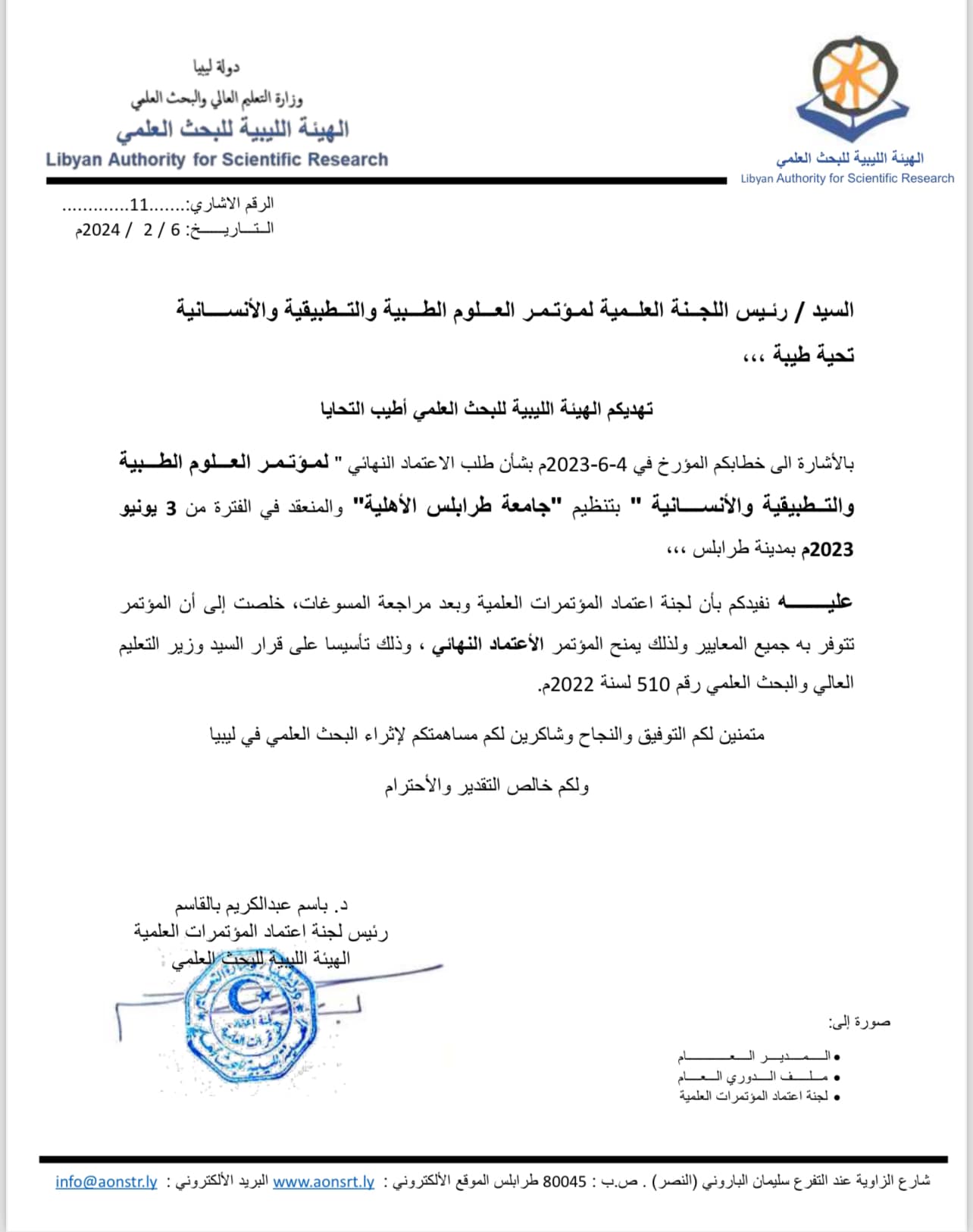 اقرأ المزيداستم مركز البحث العلمي والتعاون الدولي اليوم مراسلة الاعتماد النهائي لمخرجات المؤتمر الليبي الدولي السابع للعلوم الطبية والتطبيقية والانسانية والمقام بتنظيم من جامعة طرابلس الاهلية من لجنة اعتماد المؤتمرات بالهيئة العامة للبحث العلمي حيث يعتبر هذا المؤتمر سلسلة من المؤتمرات التي تعقد سنويا بإ...
