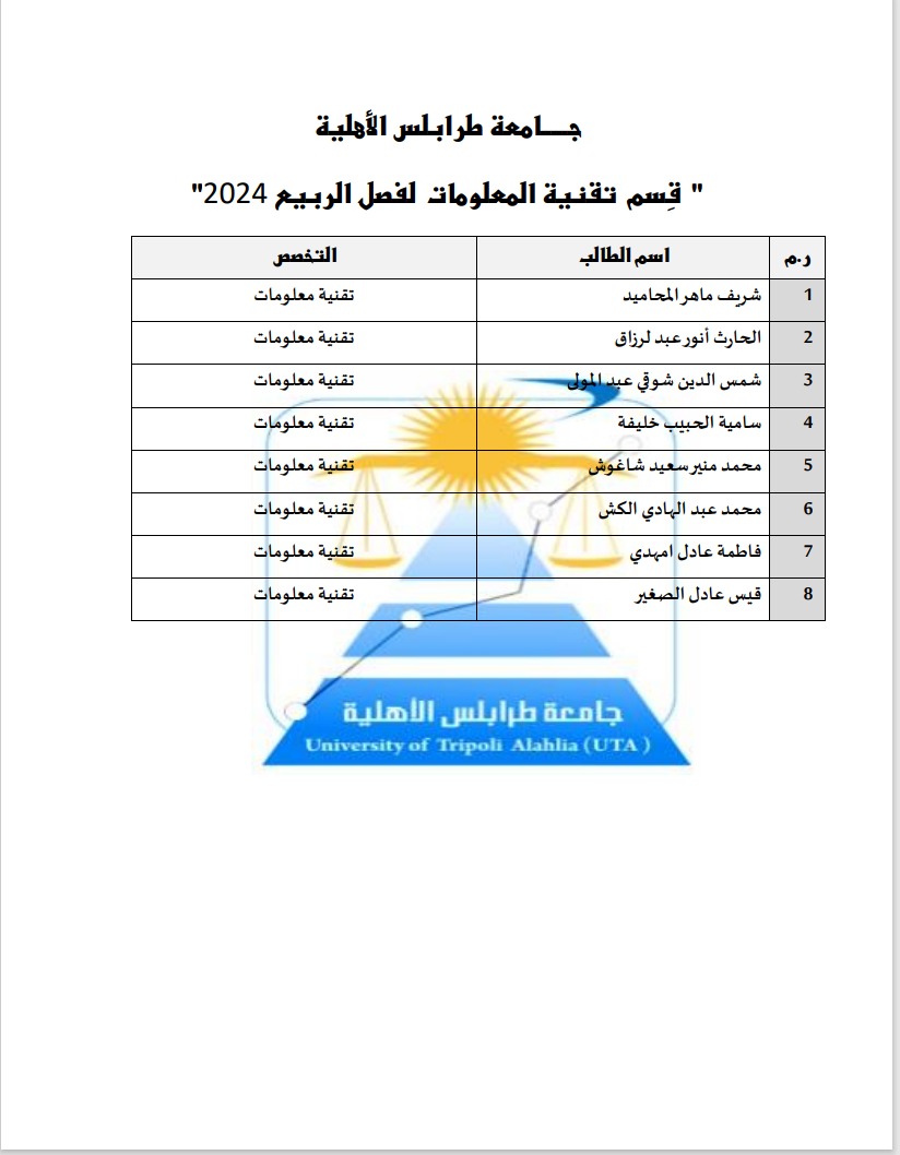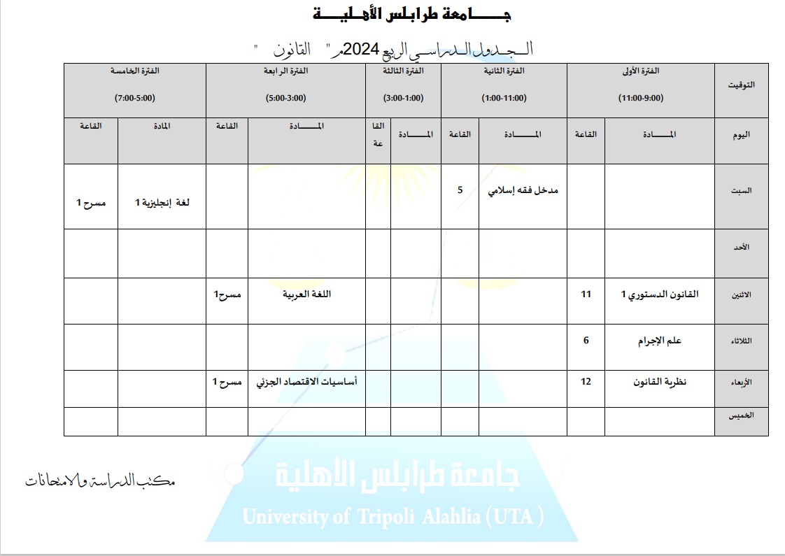 اقرأ المزيدالطلبة والطالباتيُعلمكم مكتب الدراسة والإمتحاناتبالجدول الدراسي لطلبة الفصل الأول "الطلبة الجُدد "لفصل ربيع2024م للأقسام التالية :" قسم إدارة الأعمال - قسم المحاسبة -قسم القانون - قسم اللغة الإنجليزية - قسم تقنية المعلومات- قسم التصميم الداخلي .تمناتنا للجميع الطلاب بالتوفيق والنجاح...