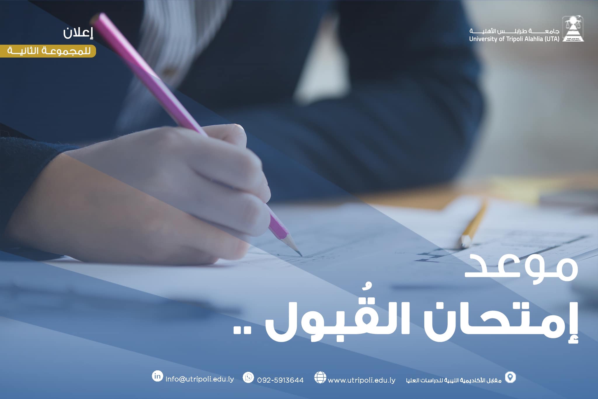 اقرأ المزيدالطلبة والطالباتيُـــفِـــــــــيــــدكــــم " قسم التسجيل والقبول بالجامعة “بأن موعد امتحان القبول" للمجموعة الثانية "للطلبة الجُدد وطلبة المعادلة "للفصل الدراسي الربيع 2024مللأقسام التالية: “ قسم إدارة الأعمال - قِسم المحاسبة - قسم القانون – قسم اللغة الإنجليزية- قِسم المختبرات ا...
