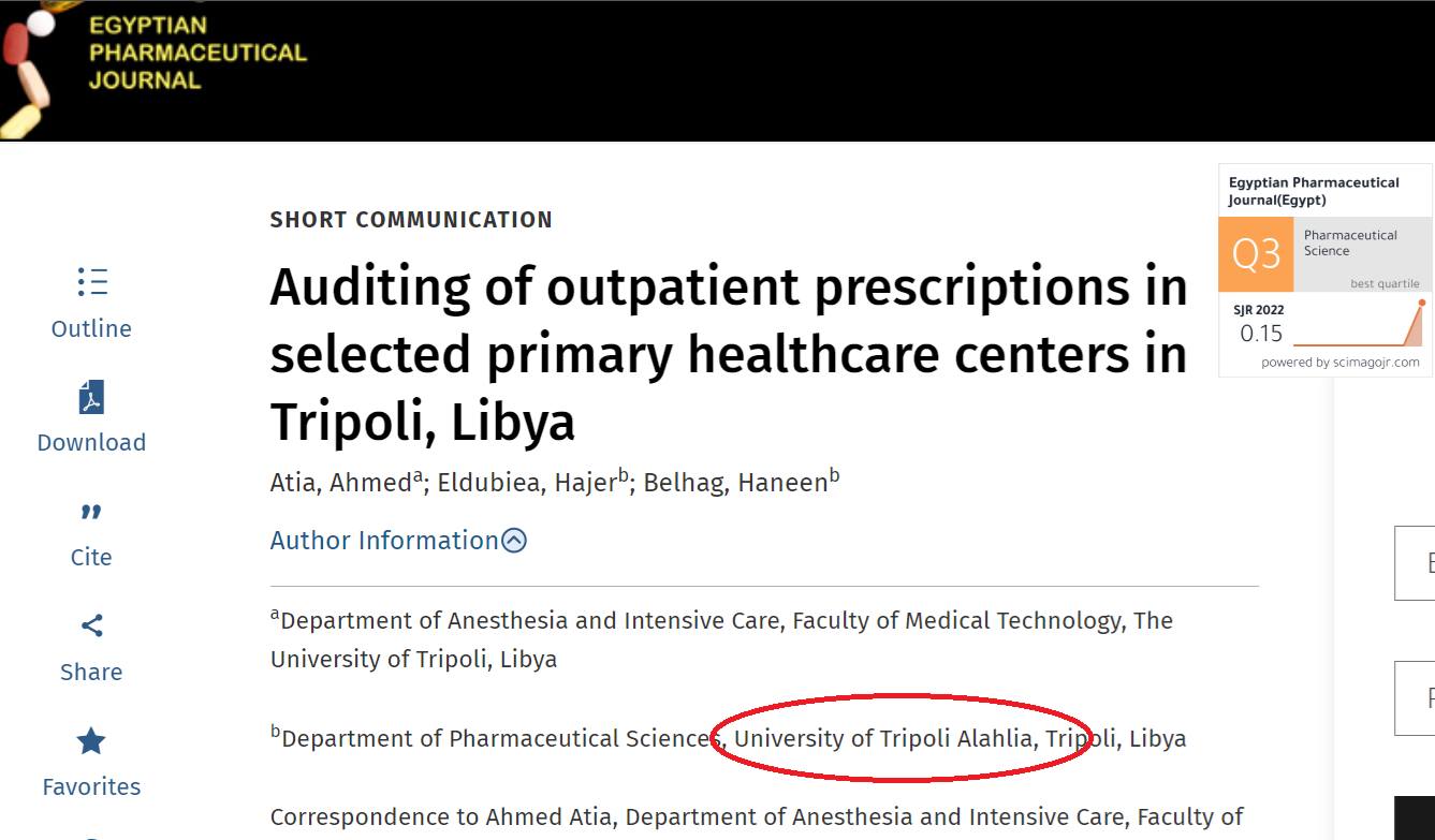 اقرأ المزيدنشر بحث علمي جديد لباحثين من جامعة طرابلس الاهلية بمجلة علمية ضمن مستوعب سكوبس لخريجات من قسم العلوم الصيدلانيةتحت إشراف د. احمد عطيةSHORT COMMUNICATIONAuditing of outpatient prescriptions in selected primary healthcare centers in Tripoli, LibyaAtia, Ahmeda; Eldubiea, Hajerb; Belhag, HaneenbAuthor ...