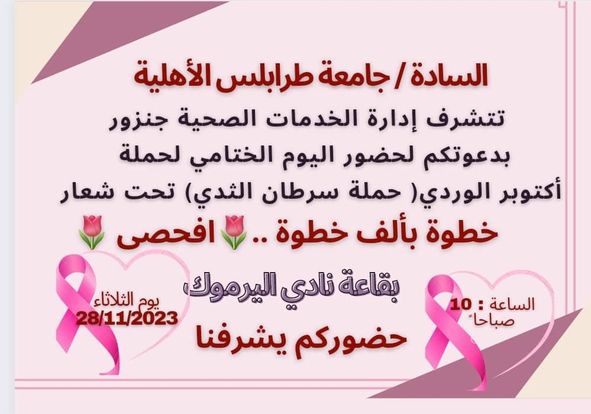 اقرأ المزيدمشاركة جامعة طرابلس الاهلية في اليوم الختامي لحملة اكتوبر الوردي بدعوة من إدارة الخدمات الصحية جنزور اليوم بمسرح الاكاديمية الليبية للدراسات العليا ...