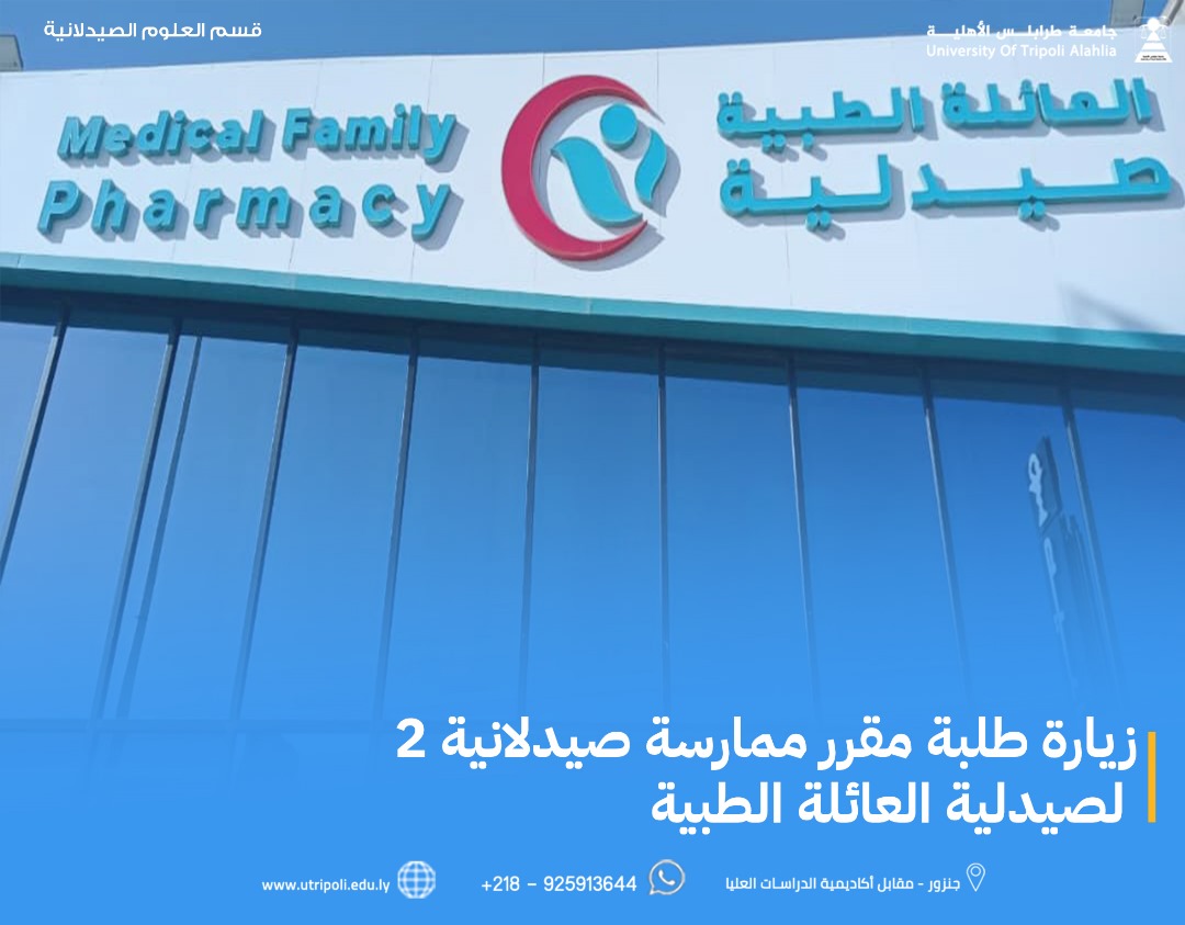 اقرأ المزيدفي إطار التدريب المستمر لطلبة قسم العلوم الصيدلانيةبجامعة طرابلس الأهلية ,وتفعيلاً للإتفاقية التعاون المبرمة مع مجموعة صيدلانيات العائلة الطبيةنفذ قسم العلوم الصيدلانية زيارة علمية لصيدلية العائلة الطبية " فرع غوط الشعال "بإشراف أ.د. عبد الرؤوف المبروك خلف لطلبة مقرر "ممارسة صيدلانية 2 "يوم الاثنين ...