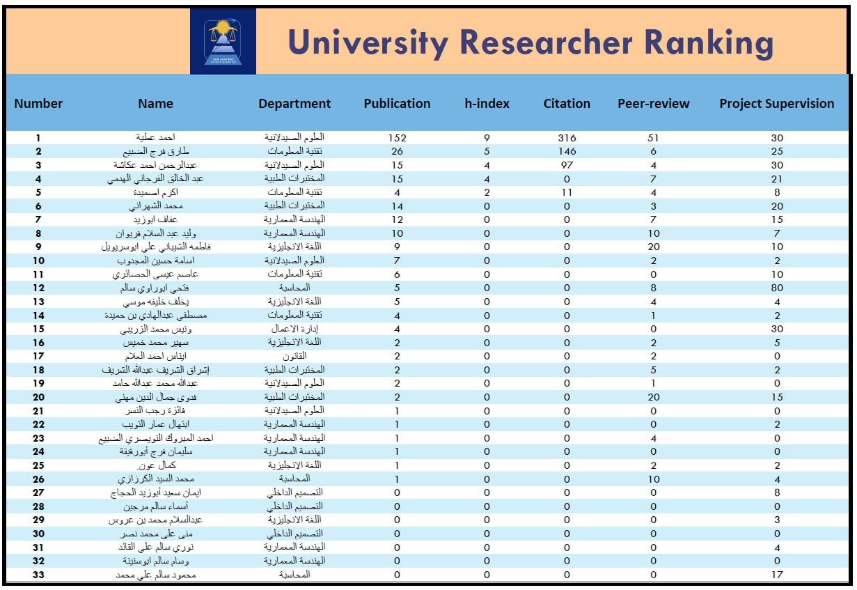 اقرأ المزيدقائمة بأفضل الباحثين بجامعة طرابلس الاهلية حسب مؤشر h...