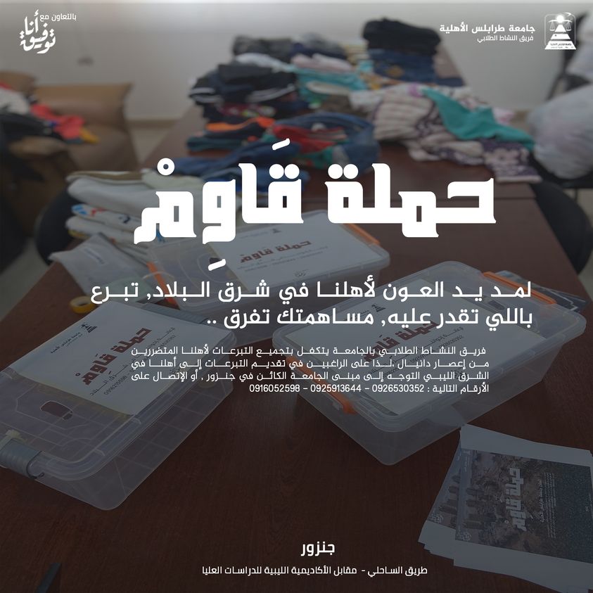 اقرأ المزيدأطلقت جامعة طرابلس الأهلية اليوم الأربعاء الموافق 13-9-2023م حملة تبرعات بِعنوان " قَاومْ " لجمع ( مبالغ مالية -ملابس - مواد غذائية - مواد تنظيف ) تُخصصها لمُساعدة المُتضررين من الفياضانات لإخـــوتِنــا في الشرق الليبي .فعلى جميع من يريد مَــد يَـــد العَون والمُساهمة في هذه الحملة التواصل مع إدارة ...