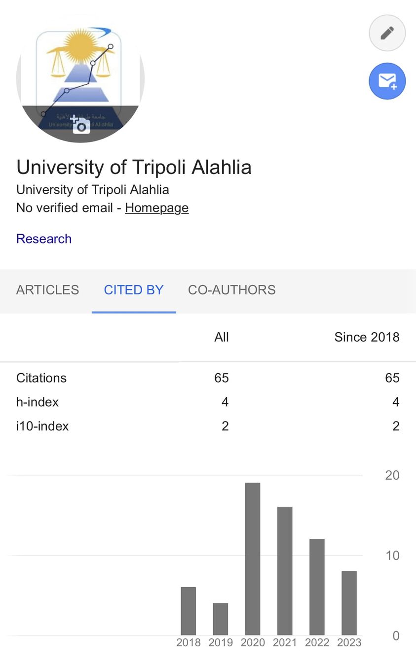 اقرأ المزيدازدياد عدد الاستشهادات لجامعة طرابلس الاهلية الي 65 حسب مؤشرات قوقل سكولارهذا ويذكر ان للجامعة مايفوق 30 بحث علمي منشور منها 3 بحوث ضمن قواعد بينات سكوبس...