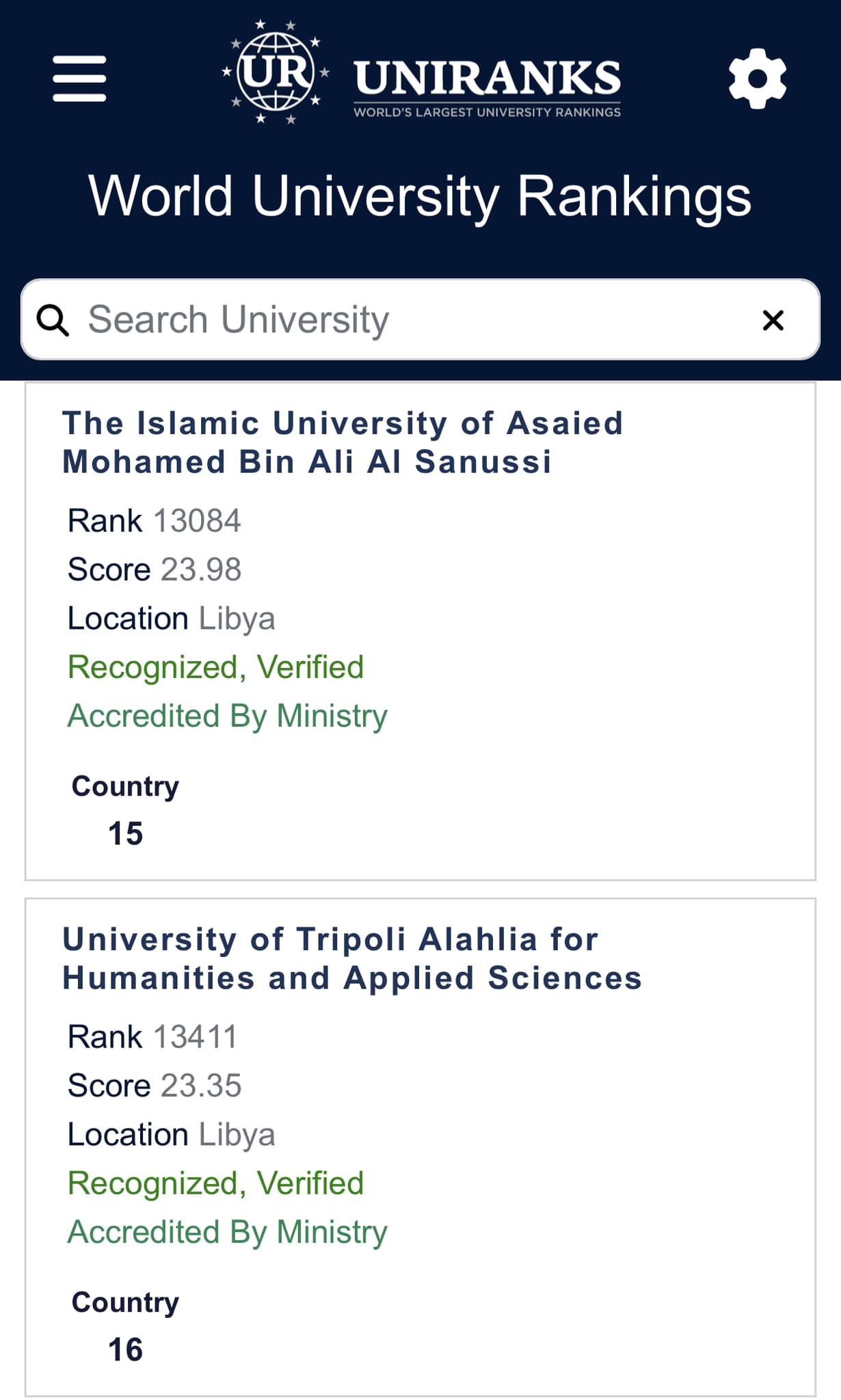 اقرأ المزيدجامعة طرابلس الاهلية في المرتب 16 محليا والاولي علي الجامعات الخاصة المعتمدة حسب مؤشر UniRanks.تصنيف Uniranks يُعَدُّ مرجعًا هامًا لتقييم ومقارنة الجامعات حول العالم، حيث يعتمد على مجموعة من المؤشرات وطرق جمع البيانات الموثوقة.للمزيد من التفاصيل والاطلاع على التصنيف الكامل، يمكن زيارة الرابط التالي:...