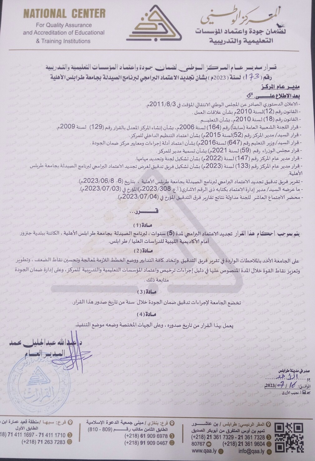 اقرأ المزيدبفضل الله وتوفيقه وبحرص الإدارة العليا لجامعة طرابلس الأهليةوجهود السادة القائمين على برنامج العلوم الصيدلانية (قسم الصيدلة)صدر قرار السيد مدير عام المركز الوطني لضمان الجودةبتجديد الاعتماد(لمدة 5 سنوات) بعد عملية التدقيق البرامجيالتي قام بها الفريق المكلف أثناء زيارته الميدانية للبرنامجوالتي استمرت...