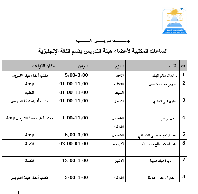 اقرأ المزيدجامـــــــــــعة طـرابـــــلس الأهـــــــــليـة الساعات المكتبية لأعضاء هيئة التدريس بقسم اللغة الإنجليزية...