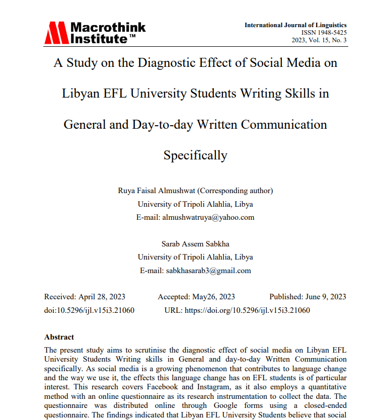 اقرأ المزيدبدعم من مركز البحث العلمي والتعاون الدولي بجامعة طرابلس الاهلية تم قبول ونشر بحث علمي جديد لطالبات من قسم اللغة الانجليزية بالمجلة الدولية للغاتInternational Journal of Linguisticsوالتي تصدر من امريكيا الطالبات : رؤيا وسرابرابط البحثhttps://www.macrothink.org/journal/index.php/ijl/article/view/2106...
