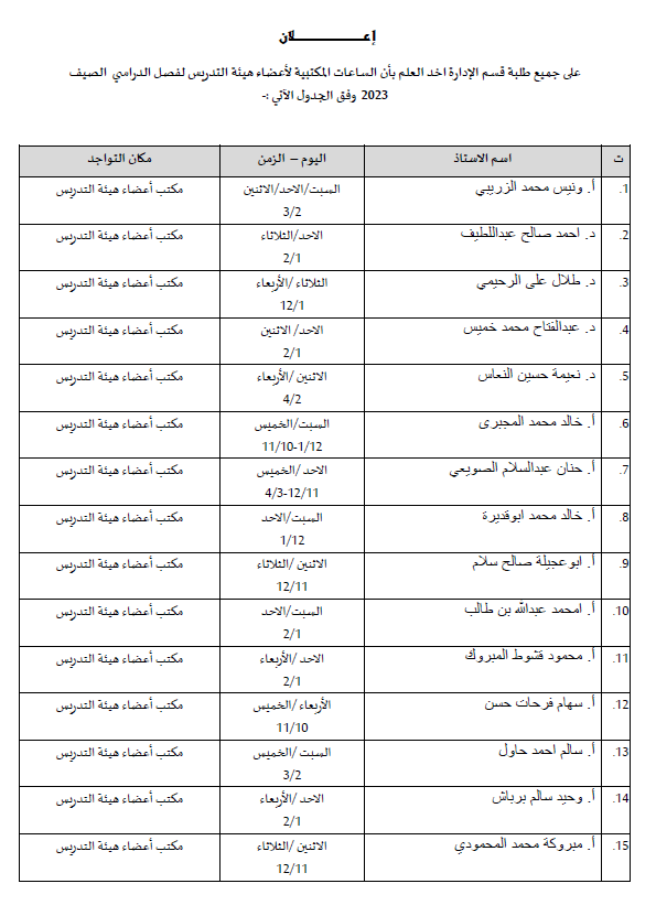 إعـــــــــــــــــــــــــلان على جميع طلبة قسم الإدارة اخد العلم بأن الساعات المكتبية لأعضاء هيئة التدريس لفصل الدراسي الصيف 2023 وفق الجدول الآتي :-...