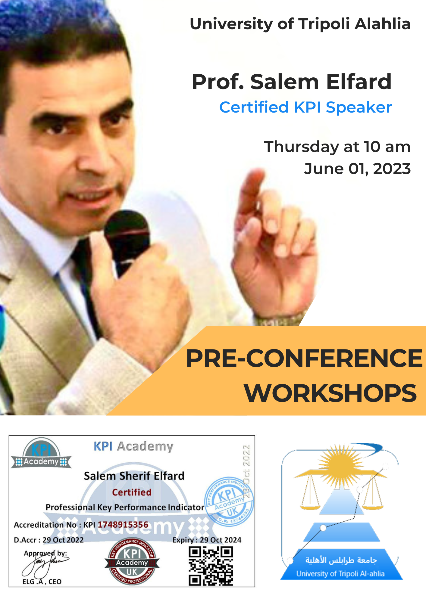 اقرأ المزيدإعلانالسادة المشاركين والمدعويين لحضور ورش العمل المصاحبة للمؤتمر الليبي السابع للعلوم الطبية والتطبيقية والانسانية الذي تقيمه جامعة طرابلس الاهلية.نفيدكم بأن ا.د. كمال إمام خبير الجودة المصري لم يتمكن من القدوم الي ليبيا للمشاركة في ورش العمل.عليه نحيطكم علما بأن ا. د. سالم الشريف سيقوم بعون الله م...