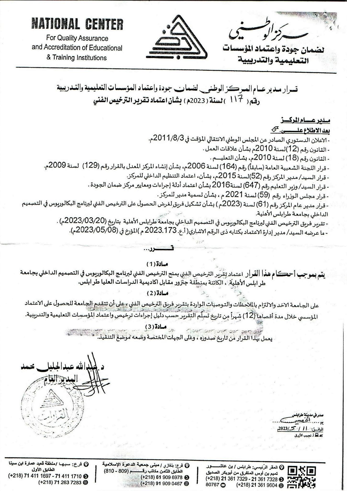 اقرأ المزيدصدر قرار مدير عام مركز ضمان الجودة وإعتماد المؤسسات التعليمية رقم 117 لعام 2023 بشأن إعتماد تقرير الفحص الفني لبرنامج بكالوريوس تصميم داخلي بجامعة طرابلس الاهلية...