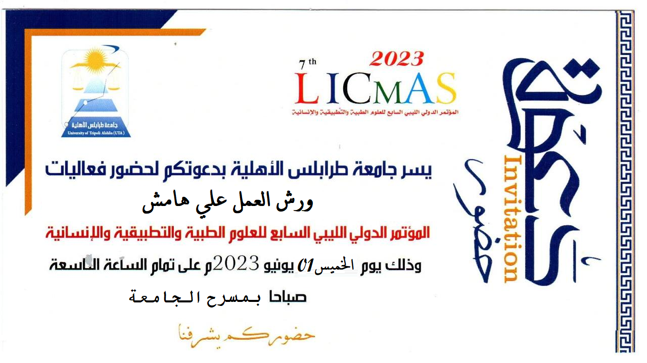 اقرأ المزيدتدعوكم جامعة طرابلس الاهلية عن طريق مركز البحث العلمي والتعاون الدولي بالجامعة لحضور فعاليات ورش العمل المصاحبة للمؤتمر وذلك يوم الخميس الموافق 01/06/2023 علي تمام الساعة 9 صباحاالدعوة عامة لكل المهتمين من الاكاديميين والباحثين...