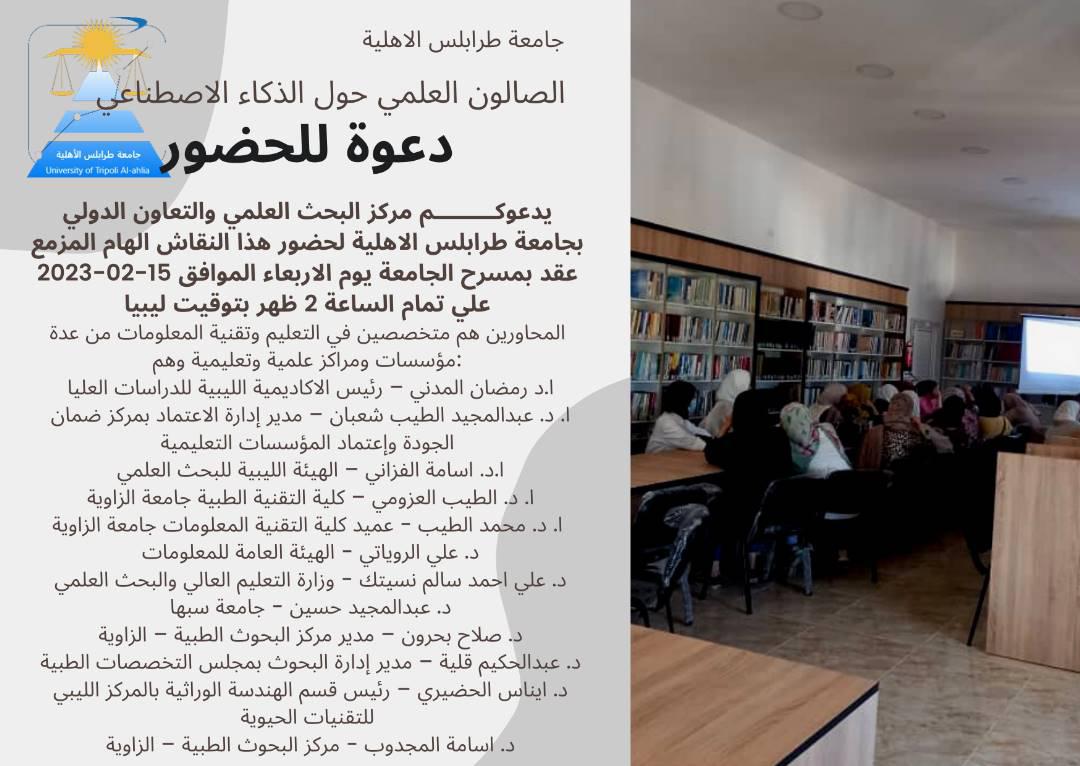 اقرأ المزيدبدعم من السيدة دشيرين نجيم، تم اليوم الاربعاء الموافق 15 فبراير 2023م على تمام الساعة الثانية بعد الظهر وبمسرح جامعة طرابلس الأهلية تنظيم جلسة حوارية حول الذكاء الاصطناعي ودار النقاش حول اخر المستجدات في برامج الذكاء الاصطناعي وهو GPT Chatحيث ضم النقاش كل من السادة المحاورين : • &n...