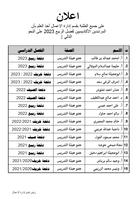 اقرأ المزيداعلانعلى جميع الطلبة بقسم إدارة الاعمال أخذ العلم بأن المرشدين الأكاديميين لفصل الربيع 2023 ...