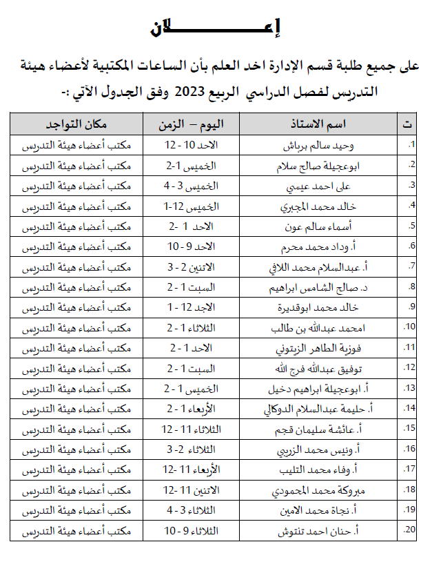 اقرأ المزيدإعلانعلى جميع طلبة قسم الإدارة اخد العلم بأن الساعات المكتبية لأعضاء هيئة التدريس لفصل الدراسي الربيع 2023...
