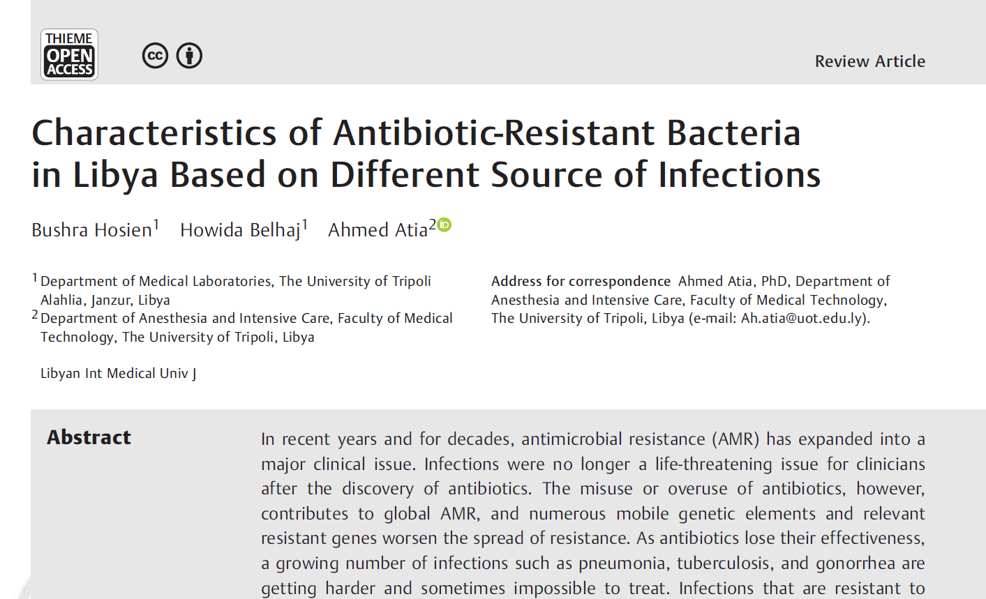 اقرأ المزيددعما وتشجيع من مركز البحث العلمي والتعاون الدولي بالجامعة علي نشر البحوث العلمية تم نشر بحث اخر ضمن مشروع تخرج للطالبات (بشري عمار – هويدا بلحاج) بمجلة الجامعة الليبية الدولية الطبية بنغازي (مجلة دولية محكمة متاحة عبر قواعد بيانات كبري مثل EBSCO, ProQuest) بعنوان: خصائص البكتيريا المقاوم...