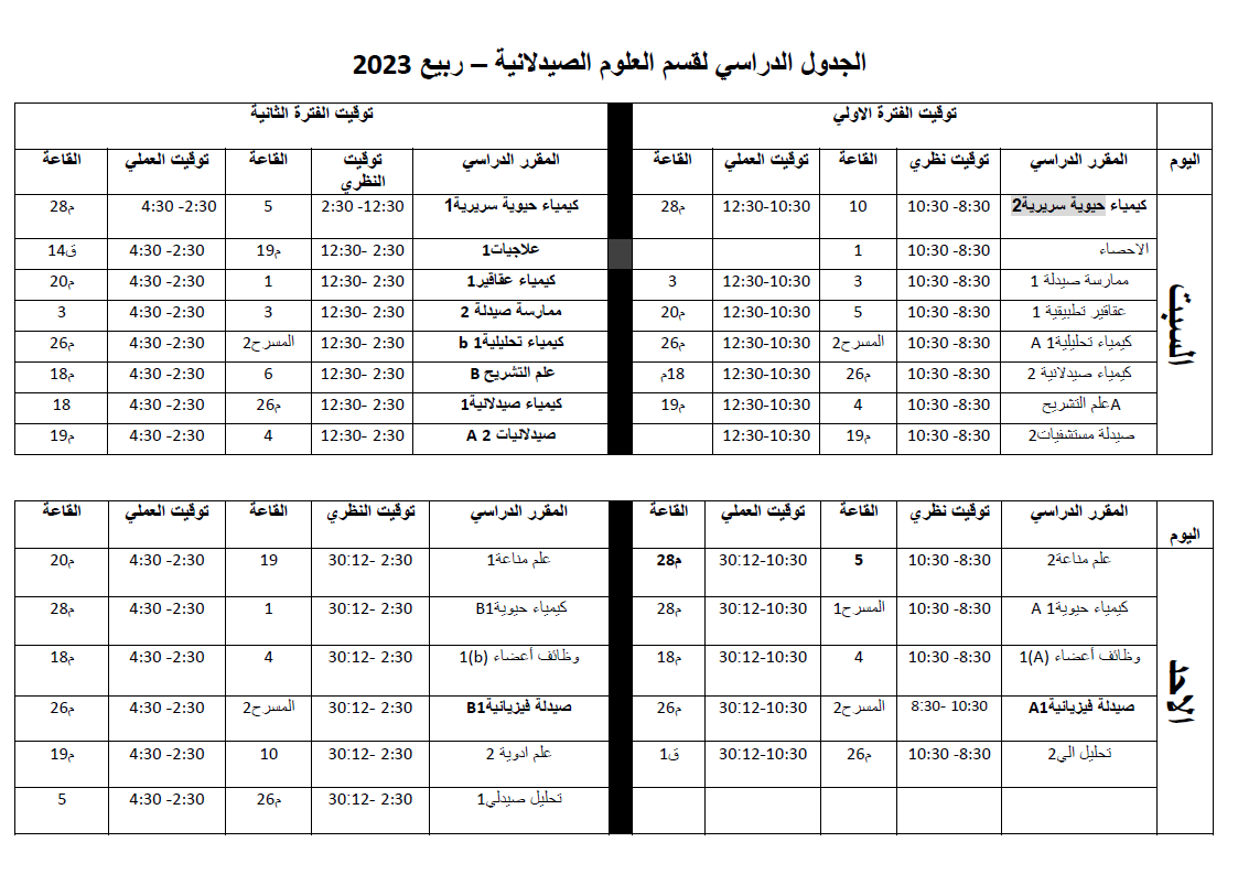 الجدول الدراسي لقسم العلوم الصيدلانية – ربيع 2023 ...