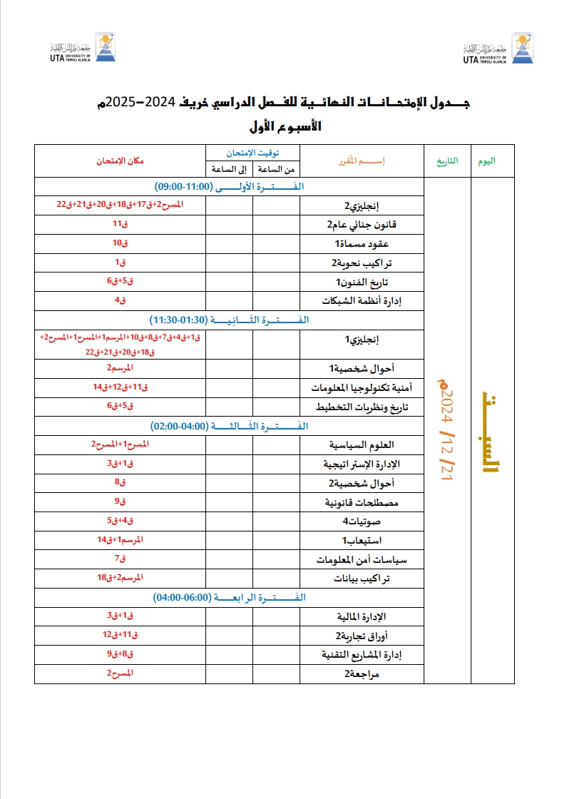 جدول الإمتحانات النهائية للفصل الدراسي خريف 2024-2025م...