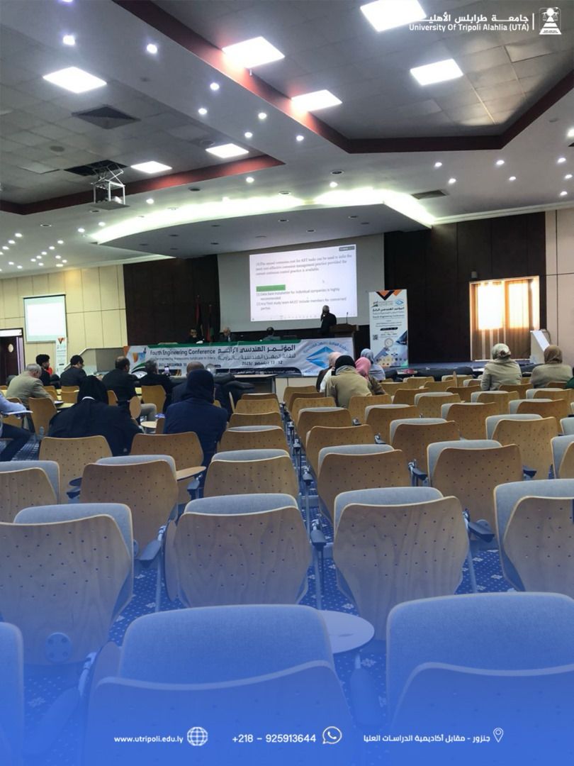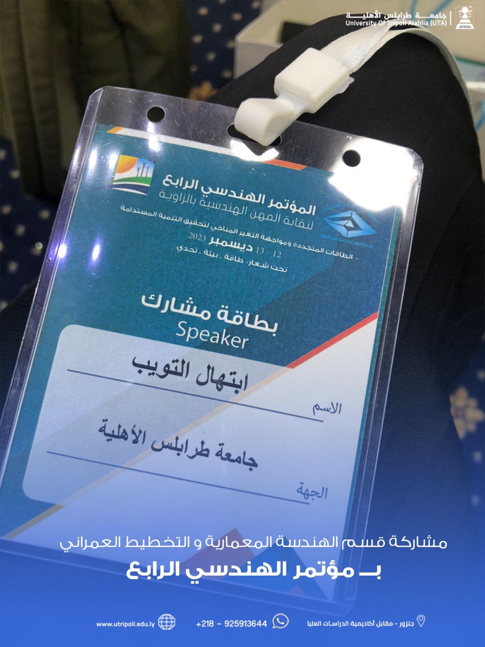 في إطار الدعم الذي تقدمه جامعة طرابلس الاهلية لتعزيز أسس البحث العلمي وتحفيز الباحثين, شاركت ا.م ابتهال التويب منسقة الجودة بقسم الهندسة المعمارية والتخطيط العمراني بفاعليات المؤتمر الهندسي الرابع الذي اقيم اليوم بمركز البحوث الطبية بالزاوية حيث شاركت ببحث علمي بعنوان (الحياة بين المباني :دور الفضاءات العامة في دعم التواصل الاجتماعي )