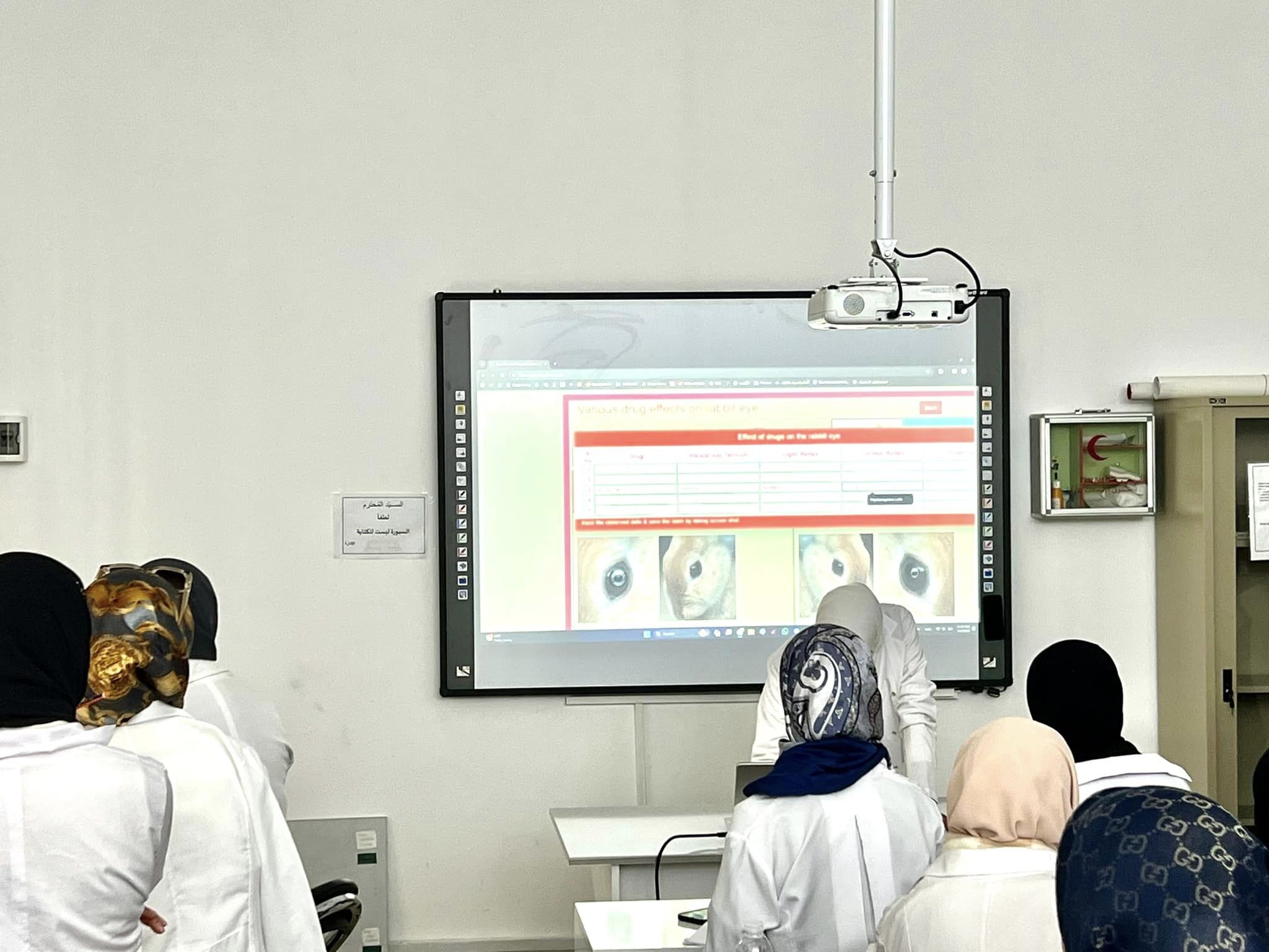 ضمن مقرر علم الادوية العملي لطلاب قسم العلوم الصيدلانية، تم استخدام برنامج المحاكاة الافتراضية في تنفيذ التجربة المعملية لهذا اليوم وهي عن استخدام عدة انواع من قطرات العين علي الارنب لمعرفة تأتيراتها المختلفة منها ضغط العين