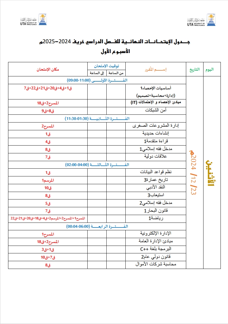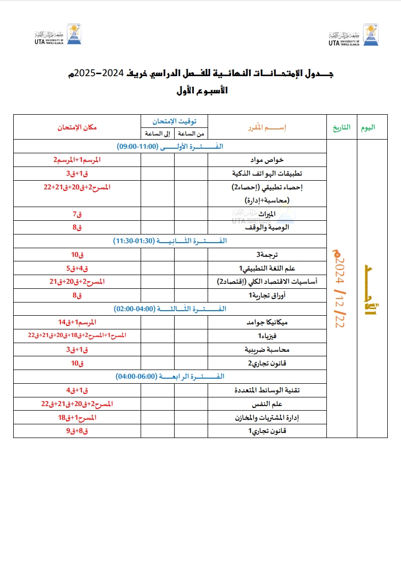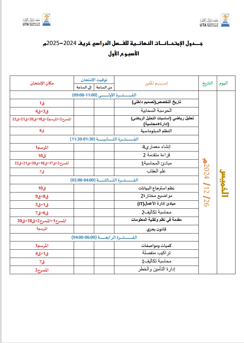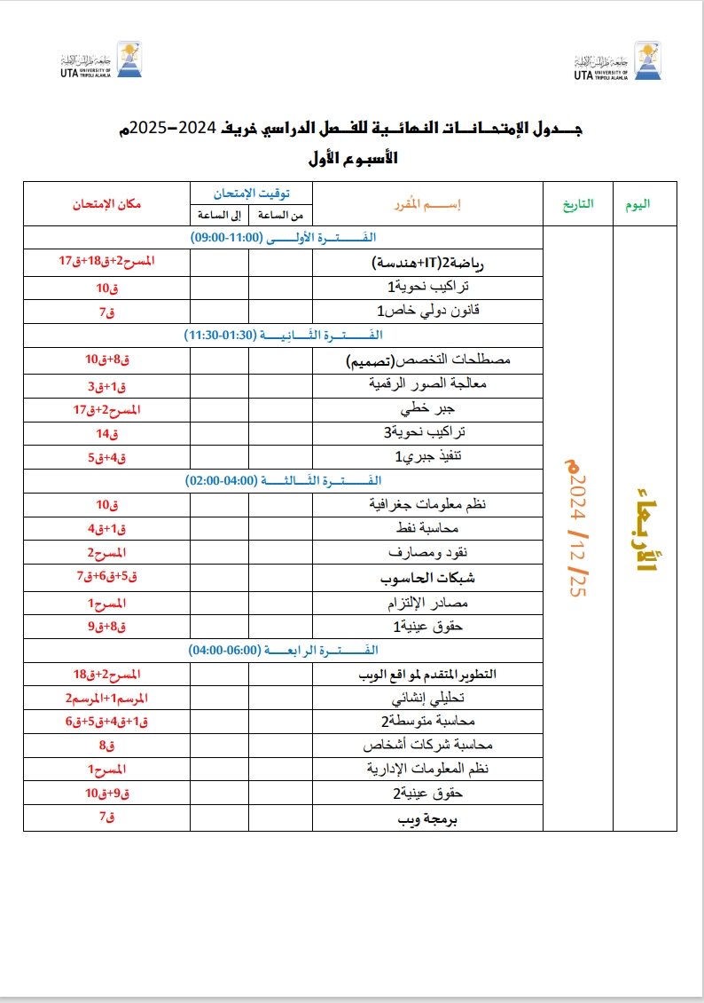 جدول الإمتحانات النهائية للفصل الدراسي خريف 2024-2025م