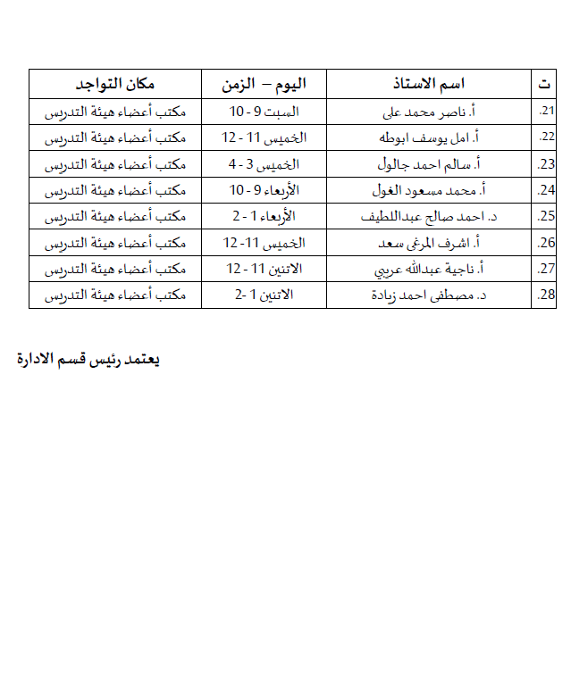 إعلانعلى جميع طلبة قسم الإدارة اخد العلم بأن الساعات المكتبية لأعضاء هيئة التدريس لفصل الدراسي الربيع 2023