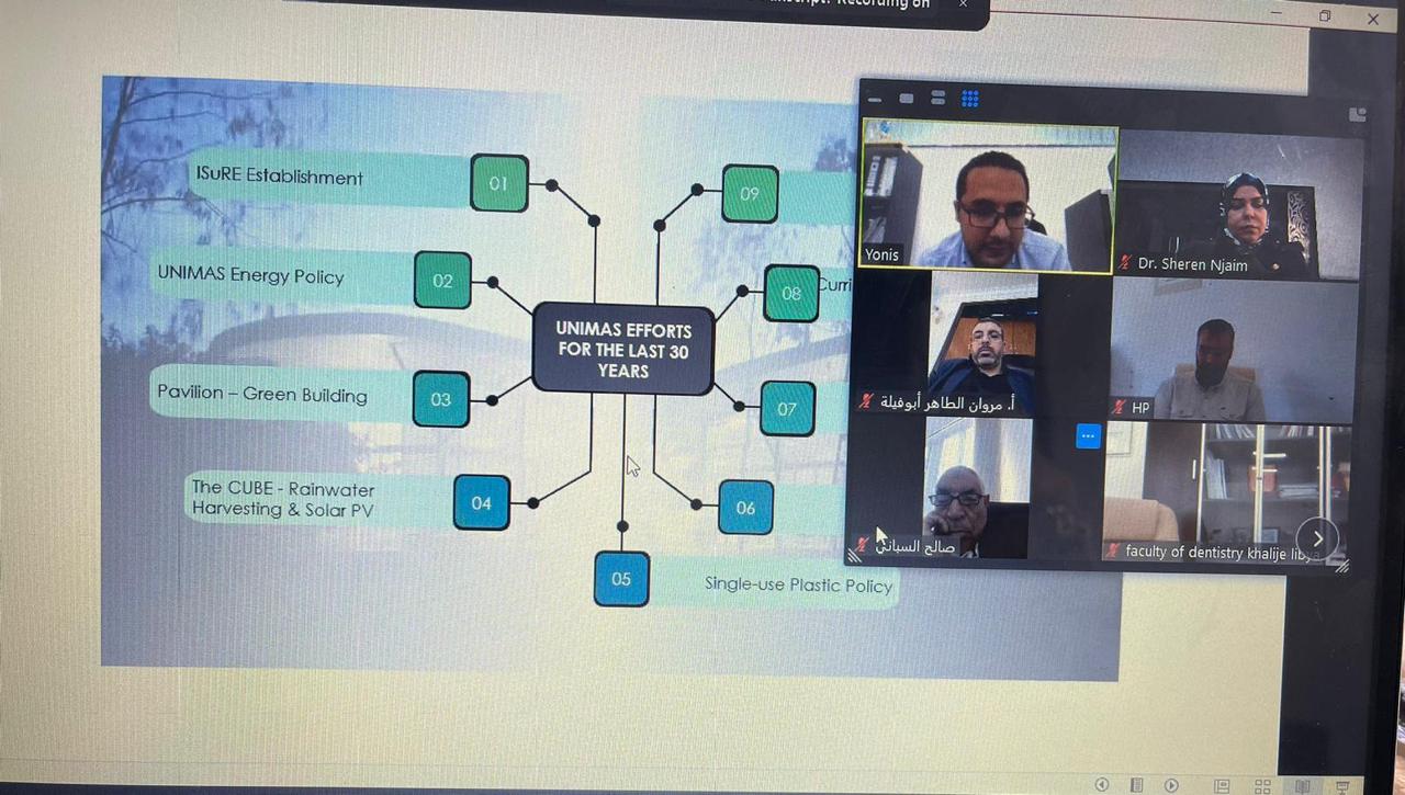 عقد اليوم السبت الموافق 18-03-2023 ندوة علمية عبر الزووم حول تغير المناخ والاستدامة وذلك للإستفادة من مبادرة استراتيجية صفر كربون في الحرم الجامعي. حيث نفذ المحاضرة المدرب د. يونس ابوسويق, عضو هيئة تدريس بقسم الهندسة الكهربائية بجامعة سراواك ماليزيا ونائب مدير معهد الاستدامة والطاقات المتجددة وذلك بحضور السيدة رئيس الجامعة د. شيرين نجيم وباقي اعضاء مجلس الجامعة.